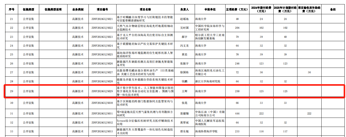 今日,公司收到海南省科学技术厅文件——《海南省科学技术厅关于 2024 年省重点研发第一批(公开征集、联合征集等)项目和经费安排的通知》,188app金宝搏网页登录和海南大学(牵头单位)、广东工业大学联合研究的项目“基于数字孪生技术、人工智能和图像识别的数字基坑全寿命自动化安全监测、预测与预警一体化技术研究”项目获得海南省政府批准,作为海南省重点研发项目,海南省财政支持科研经费250万元,公司自筹275万元,合计经费525万元。