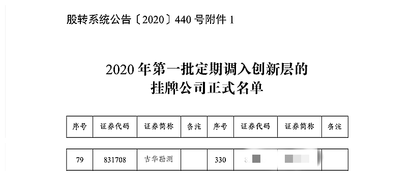 根据《全国中小企业股份转让系统分层管理办法》和《关于2020年市场分层定期调整相关工作安排的通知》,全国股转公司在近期稳步推进市场分层调整工作。经过主办券商核查、挂牌公司申请、全国股转公司初筛、接受市场异议和挂牌委员会审议等各项程序后,全国股转公司确定了2020年首批调入创新层挂牌公司名单。5月22日,全国中小企业股份转让系统公布了《2020年第一批定期调入创新层的挂牌公司正式名单》,吉华勘测凭借良好的业绩和快速稳健的发展顺利进入创新层(吉华勘测序号:79)。