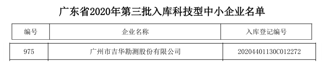 6月5日,广东省科学技术厅公示了2020年第三批入库科技型中小企业名单,吉华勘测成功入库(编号:975),再次拿下一张“技术牌照”。