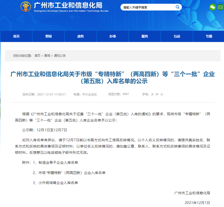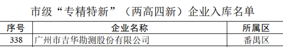根据广州市工业和信息化局12月1日在官网公布的文件,广州市吉华勘测股份有限公司成功入库市级“专精特新”(两高四新)企业。