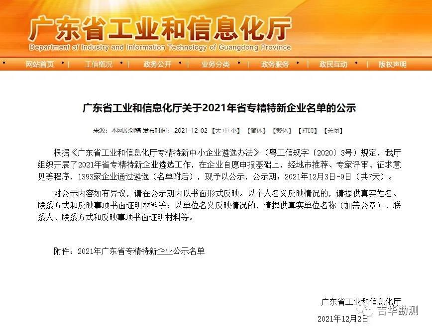 根据广东省工业和信息化厅官网信息(如下),广州市吉华勘测股份有限公司通过2021年省专精特新企业遴选,已于2021年12月3日-9日进行公示。
