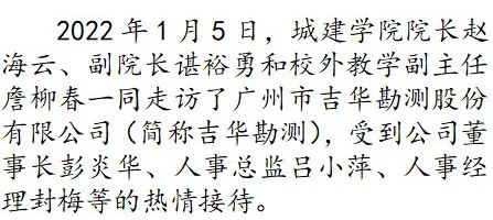 1月5日,广州华立学院城建学院院长赵海云教授、书记兼副院长谌裕勇和校外教学副主任詹柳春一行到访我司,共商校企合作,并与我司签署了校外实习基地合作协议。 广州华立学院(原广东工业大学华立学院)建于1999年,2004年经教育部批准,成为广东省第一批独立学院,全面实施本科教育,是一所综合实力突出、办学特色鲜明,工、经、管、文、艺术等学科协调发展的应用型本科大学,毕业生就业率位居省内高校前列。 以下为广州华立学院官方新闻: