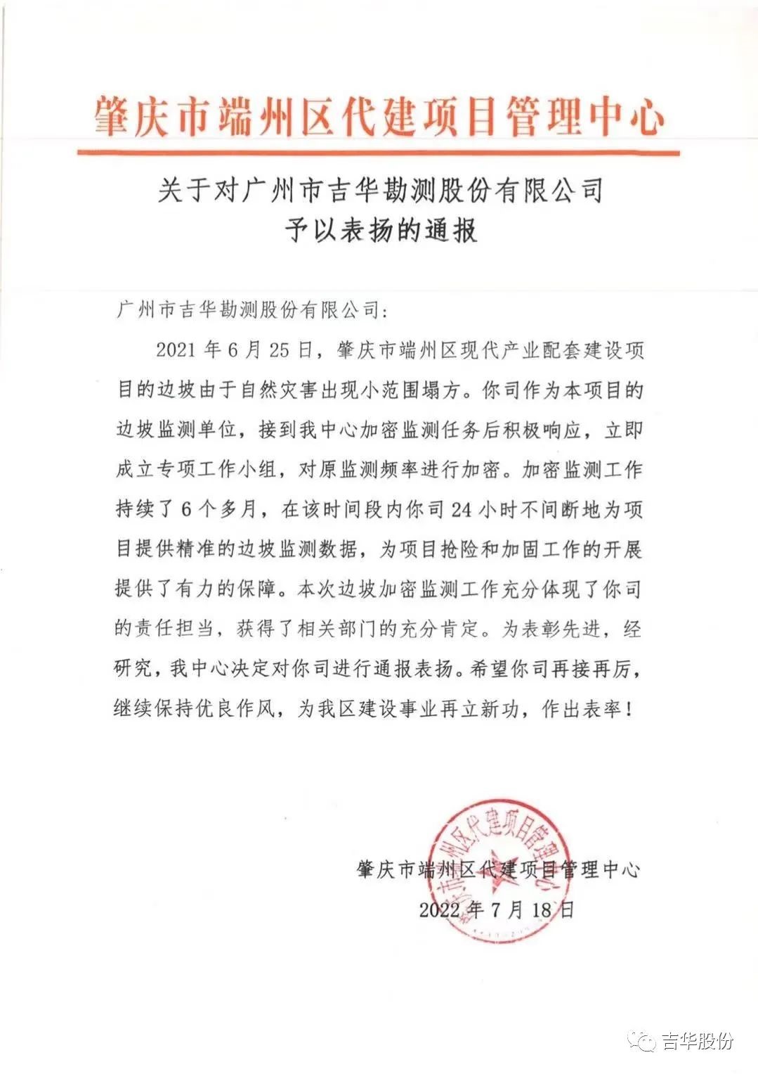 近日,公司受到肇庆市端州区代建项目管理中心通报表扬,通报中甲方充分肯定了188app金宝搏网页登录在端州区现代产业配套建设项目边坡抢险中的应急监测服务。
