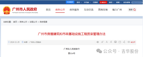 近日,广州市人民政府公布了《广州市房屋建筑和市政基础设施工程质量管理办法》,将于2025年1月1日起施行,具体公告如下: