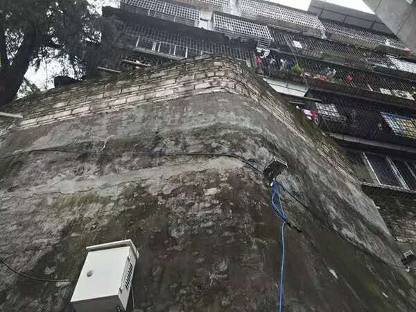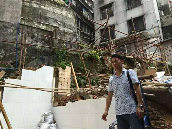 从现场看来,三处挡土墙除了最高的一处保存还算完好,另外两处因为年代久远,都出现了不同程度的垮塌。而周边的房屋多为4-8层,估计有30年以上楼龄。因为是早期集资建房,它们的地基基础没有详尽的资料。