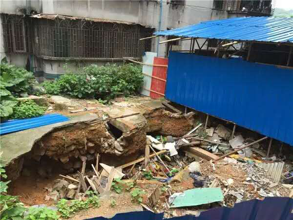 距离这里数十米远的一处无人居住的危房,地基被掏空而坍塌,现场至今还留有深约两米的大坑。