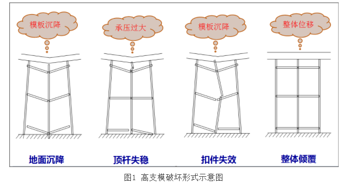 高支模安全事故主要是由于高支模在荷载作用下产生过大变形或过大位移,诱发系统内钢构件失效或者诱发系统的局部或整体失去稳定,从而发生高支模局部坍塌或整体倾覆,造成施工作业人员伤亡。