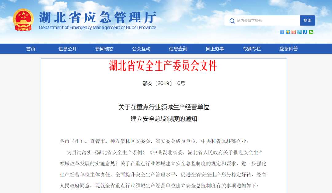2019年8月29日,湖北省安委会发布《关于在重点行业领域生产经营单位建立安全总监制度的通知》,明确了安全总监制度的实施范围,安全总监的任职条件、任免及待遇。